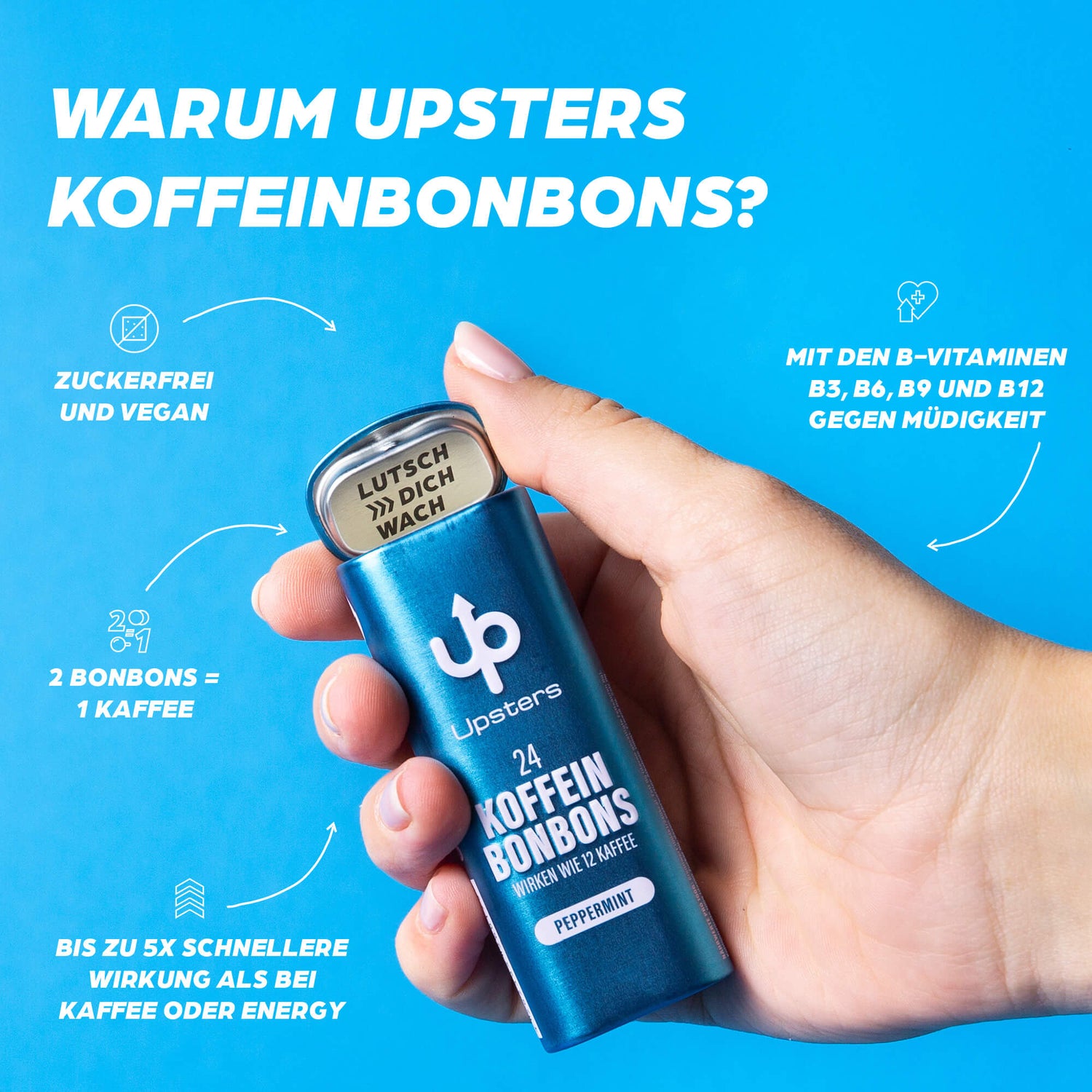 Die Upsters Koffeinbonbons passen in jede Hosentasche und geben dir den schnellen Kick To Go. Einfach rausholen und wach lutschen!